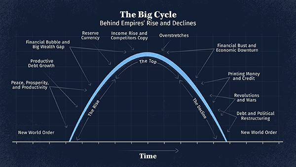 Pour rappel j’avais diffusé un épisode sur la principes de la puissance tel que compris par Ray Dalio, je vous y renvoie pour aller plus loin mais je vous en rappelle ici les grandes lignes. Selon Dalio, la puissance d'une nation repose sur 8 facteurs principaux qui forment un cycle vertueux : l'éducation et le capital humain, qui nourrissent l'innovation ; la force technologique et commerciale, qui assure la prospérité ; la puissance militaire et financière, qui permet de projeter sa force ; et enfin l'influence culturelle et la résilience institutionnelle, qui garantissent la durée. Ces facteurs forment un cycle vertueux : l'éducation stimule l'innovation, qui renforce la compétitivité, qui génère la puissance financière, qui permet d'investir dans l'éducation et la défense... C'est ce cycle que les États-Unis ont parfaitement maîtrisé pendant des décennies et on peut même arguer que jamais une seule nation n’a été aussi puissante, hormis peut-être l’empire britannique à son apogée, mais je laisse ce débat aux spécialistes.